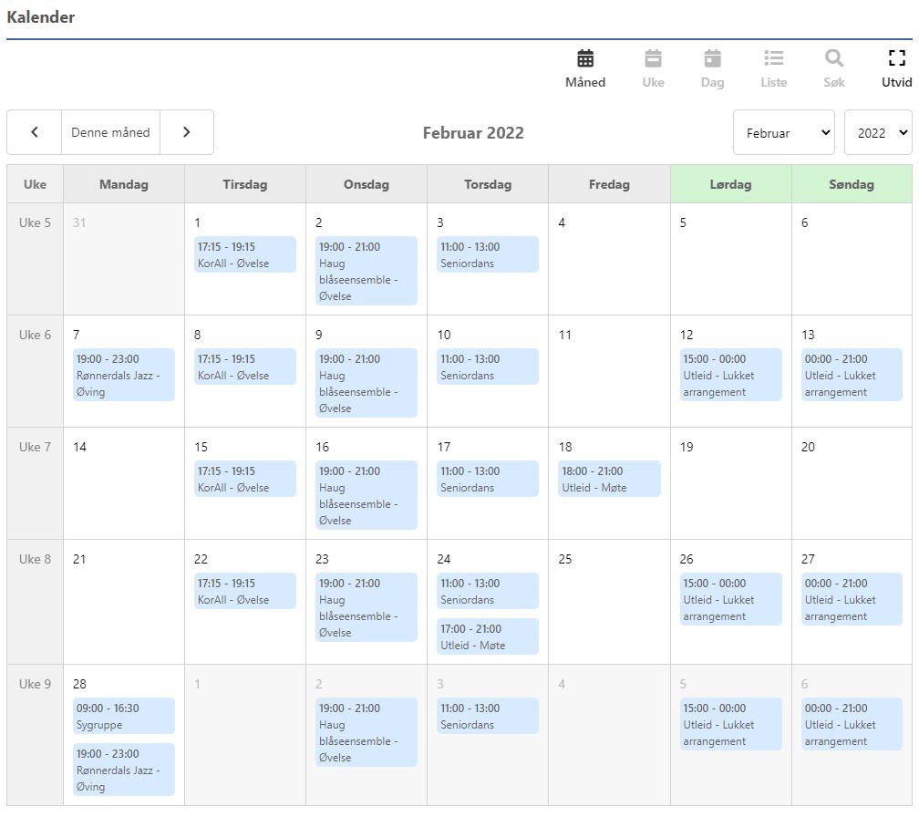 Her ligger både terminliste for ukentlige aktiviteter og utleiekalender for det inneværende året.